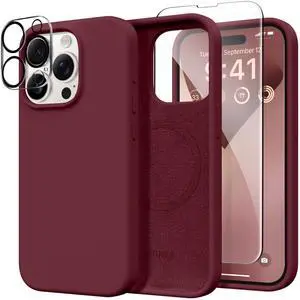 for iPhone 15 Pro Max Case Silicone, Compatible with Magsafe, Camera Protector + Screen Protector, Soft Anti-Scratch Microfiber Lining, Liquid Silicone Shockproof Phone Cover, Maroon