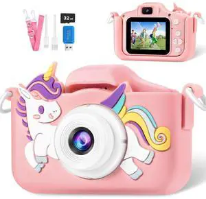 Kids Camera, Toys for Toddlers Age 3-8 Year Old Girl Christmas Birthday Gifts, Children Digital Camera with Cartoon Soft Silicone Cover and 32GB Card (Pink)