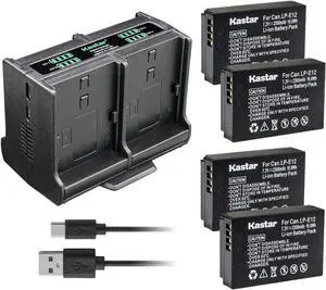 Kastar 4-Pack Battery and Quadruple Charger Compatible with Canon LP-E12 LPE12 Battery, Canon LC-E12 LC-E12E Charger, Canon EOS 100D EOS M M2 M10 M50 Mark2 M100 M200 Rebel SL1 PowerShot SX70 HS Camera