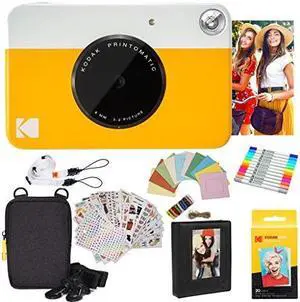 kodak printomatic instant camera yellow gift bundle + zink paper 20 sheets + deluxe case + 7 fun sticker sets + twin tip markers + photo album + hanging frames + comfortable neck strap