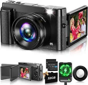 Digital Camera 4K Vlogging Camera for YouTube with 32G SD Card 180° 3''Flip Screen 16X Autofocus 48MP Video Cameras