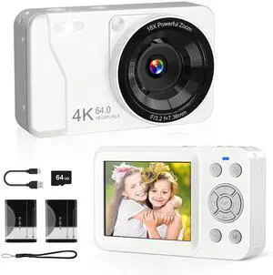 Digital Camera, 4K 64MP, 18X Zoom, Point and Shoot Digital Camera with 64GB TF Card & 2 Batteries, Portable Rechargeable Small Camera for Kids Teens Adult, White