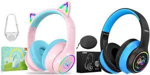 LOBKIN Kids Headphones Bluetooth 5.4,Over Ear Kids Headphones Wireless with Mic 50H Playtime Colorful LED Lights AUX Cord 94dB Safe Volume Limited Foldable Design for Boy Girl Travel/School/iPad