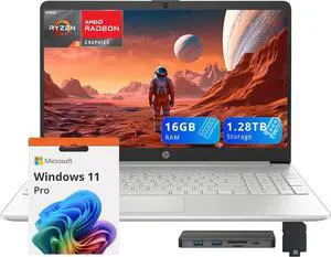 HP 15.6" FHD Laptop, AMD Ryzen 3-3250U, 16GB DDR4 RAM, 1.28TB Storage (1TB SSD + 288GB Docking Station Set), AMD Radeon Graphics, Numeric Keypad, 720p HD Webcam, Win 11 Pro, Silver
