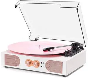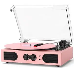 Vinyl Record Player with Built-in Speakers, Vintage 3-Speed Turntable, Bass/Treble Control, Headphone Jack, RCA/AUX Outputs, Belt-Driven LP Player, Pink