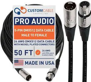 50 Foot 5-Pin XLR 24 AWG (Gauge) DMX512 Data Cable Male to Female for stage lighting, LED Uplights, DJ Lights and DMX512 Controller- made by Custom Cable Connection