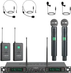 Phenyx Pro Wireless Microphone System, 4-Channel UHF Wireless Mic Set with Handheld/Bodypack/Headset/Lapel Mics, Fixed Frequency Metal Cordless Microphone for Church,Singing,DJ(PTU-5000-2H2B)