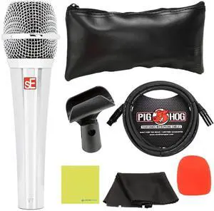 Liquid Audio sE Electronics V7 Supercardioid Dynamic Vocal Microphone in Chrome Finish Bundle w/Pig Hog PHM10 8mm Mic Cable Polishing Cloth