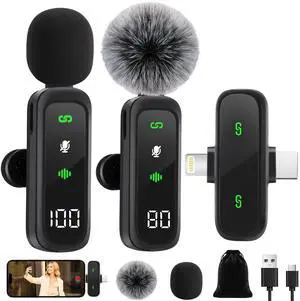 YeenMelly 2-Pack Wireless Lavalier Microphone: for iPhone 15/16, iPad, Android - Mini LED Display, Noise Reduction, Plug & Play, USB-C Charge , Clear Sound - Video/Vlog, Windscreen & Pouch Included