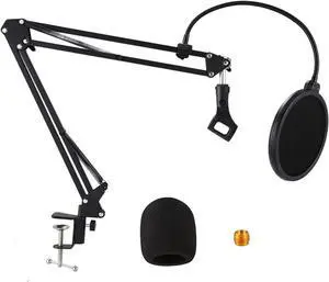 Heavy Duty Microphone Stand with Scissor Arm, Table Mounting Clamp, Pop Filter & Shock Mount Black