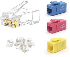 VCE 15-Pack UL Listed Blue+Red+Yellow CAT6 Keystone Coupler Bundle with 100-Pack RJ45 CAT6 Connectors Pass Through