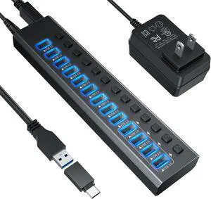 KEHIPI 10 Port Aluminum USB 3.0 hub with 10 Port USB Data Transfer,Power Adapter USB Splitter Independent Switch