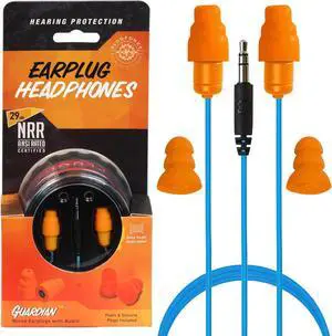 Plugfones Guardian Earplug Headphones - OSHA Approved Noise Isolating in-Ear Earbuds with Hearing Protection - Wired Hybrid for Work and Travel - Includes Silicone and Foam Ear Plugs - Blue & Orange