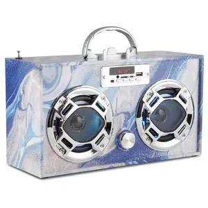 - Portable Party Speaker: Retro Boombox with Bluetooth, LED Light Show, Enhanced FM Radio, Rechargeable Battery (Blue Swirl)
