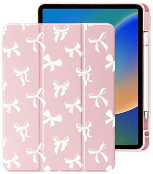 JOYLAND Cute Art Bowknot Pattern Case for iPad (A16) 11th Gen 2025 11-inch/10th Gen 2022 10.9 inch, Pencil Holder & Clear Transparent Soft TPU Back & Trifold Smart Pad Pink Cover for Girls Women