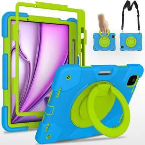 Andnary Case for iPad Air 11 inch 2024 M2 Case 6th Generation Case, Heavy Duty Protective Cover with Pencil Holder/360° Rotate Handle Stand/Shoulder Strap for A2902/A2903/A2904, Blue+Green