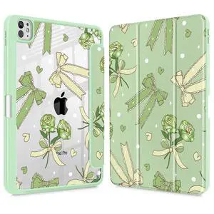 Tuiklol for iPad Pro 11 Inch (M5 2025 / M4 2024) Case, Buit-in Pencil Holder with Slim Clear Back Cover Protection Trifold Stand-Auto Wake/Sleep Tablet Case, Black Flower Bow-Green