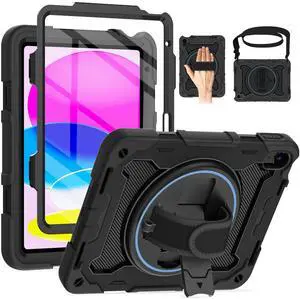 ROSROME Case for iPad A16 11th Generation 11 Inch 2025, iPad 10th Generation Case 10.9" for Kids with Screen Protector, 360 Kickstand Hand Strap, Shoulder Strap, Heavy Duty Shockproof Drop Protection