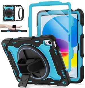 ROSROME Case for iPad (A16) 11th/10th Generation 11''/10.9'' 2025/2022, Full-Body Shockproof Protective Cover with Screen Protector, 360 Rotating Stand and Hand/Shoulder Strap, Light Blue/Black