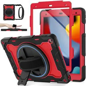 ROSROME Case for iPad 9th/8th/7th Generation iPad 10.2 inch Cover with HD Screen Protector, 360 Rotating Hand Stand/Strap, Shoulder Strap, Heavy Duty Military Grade,Kids Friendly, Red/Black