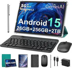 2025 Android 15 tablet with keyboard, 26GB+256GB+2TB Expand, 10 inch 2-in-1 Tablets with 8-Core, 5G WiFi, 8000mAh, BT5.0, 5MP+13MP, GMS, GPS, Widevine L1, Tablet PC with Mouse, Case, Stylus (Black)
