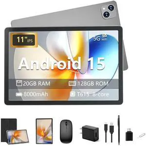 Iconiotk Android 15 Tablet 11 inch Tablet with Keyboard, 20GB+128GB, 1TB Expand, Octa-Core, 2.4G/5G WiFi, 8000mAh, BT V5.2, IPS Touch Screen, GPS, 2 in 1 with Case, Mouse, Stylus (Silver)