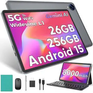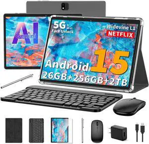 Android 15 Tablet with Keyboard, 26GB RAM, 256GB ROM(2TB Expand), 10 inch tablet with Octa-core, 8000mAh Battery, 2.4G/5G WiFi, BT 5.0, 5MP+13MP Camera, Gemini AI, Case, Mouse, Stylus (Silver Case)