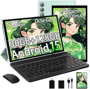 2025 Tablet 10 Inch Android 15 Tablets with Keyboard 30GB RAM 64GB ROM, Octa-Core 2-in-1 Tablet with Gemini AI, 5G WiFi, 6000mAh, HD IPS Display, GPS, Widevine L1, Split Screen, Mouse & Case -Green
