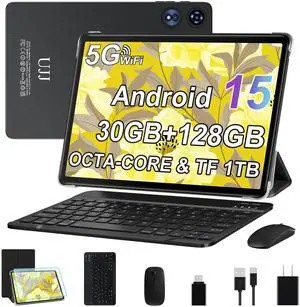 UJJ Tablet 10 inch Android 15 Tablets 30GB RAM 128GB ROM 1TB Expand, 8000mAh Octa-Core Tablets with Keyboard Mouse, HD IPS Display, Gemini AI, GPS, 5G WiFi, Widevine L1, Split-Screen - Metal Black