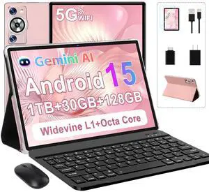 Android 15 Tablet 30GB RAM 128GB ROM 1TB TF, 2025 Electronics Tablets 10.1 Inch 8000mAh with Keyboard Mouse, 2.0GHz, 5G WiFi, BT 5.0, GMS Certified, Incell Display, Gemini AI - Rose Gold/Pink