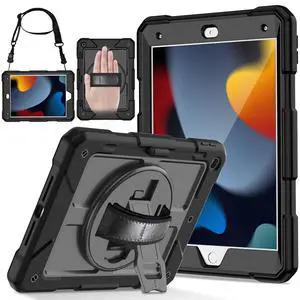 LTROP Case for iPad 9th/8th/7th Generation Case 10.2 Inch (2021/2020/2019) - Shockproof iPad Cover with Rotating Stand/Shoulder Hand Strap/Pen Holder for iPad 9/8/7 Gen, Black