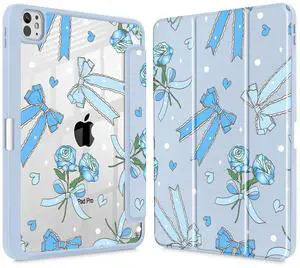 Tuiklol for iPad Pro 11 Inch (M5 2025 / M4 2024) Case, Buit-in Pencil Holder with Slim Clear Back Cover Protection Trifold Stand-Auto Wake/Sleep Tablet Case, Black Flower Bow & Rose Blue