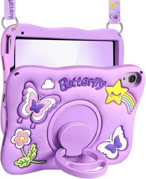 Kidcube for iPad mini 7 Case A17 Pro 2024, for iPad mini 6th Generation Case 8.3 Inch - Girls Cute Kawaii Girly 3D Purple Butterfly Design Cover with Rotating Stand & Strap Unique Silicone Women Case