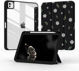 Jarviwiin Case for iPad Pro 11-inch (M5/M4) 2025/2024, Clear Back Cover with Pencil Holder Folio Slim Tri-Fold Smart Auto Wake/Sleep Lightweight for i Pad Pro 11"(Floral Black)