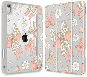 Tuiklol Case for iPad 11 inch (A16 Chip) 2025 Gen 11th / iPad 10.9 inch 2022 10th Gen, Buit in Pencil Holder with Shockproof Cover Clear Transparent Back Shell Auto Wake/Sleep,Leopard Bow Pink