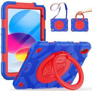 SCSVPN for iPad (A16) 11th/10th Generation Case 11 inch 2025/10.9 inch 2022, Rugged Shockproof Protective Silicone Case for Kids with Pencil Holder, Rotate Stand & Handle, Shoulder Strap - Blue/Red