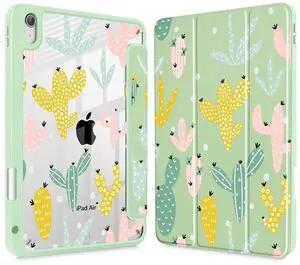 Lepeoac Case for iPad Air 11'' (M3 2025/M2 2024) 6th Gen/iPad Air 10.9'' 2022 2020 Air 5th /4th Gen, Buit in Pencil Holder with Cover Clear Transparent Back Auto Wake/Sleep, Cute Cacti-Green