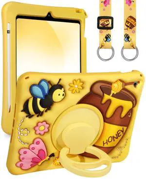 Boaretiu for iPad 9th/8th/7th Generation Case - Cute Cartoon with Shoulder Strap & Rotating Stand & Pencil Holder for Girls Boys Teens Soft Silicone Yellow 10.2 Inch Protective Case 2021/2020/2019