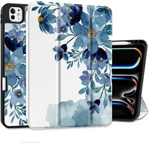 Wazzasoft for iPad Pro 13 inch Case 2024 M4 with Keyboard - Pencil Holder Folio Tablet Cover Women Girl Cute Teen Blue Floral Unique Design for Apple Pro 13 A2925 A2926 A3007