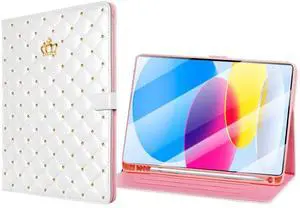 AMAZFCCY Cute Crown Case for iPad 10th Generation 10.9 Inch 2022, Flip Bling Diamond PU Leather [Smart Auto Sleep/Wake Pencil Holder Stand] Shockproof for Apple iPad 10th Gen 2022 Release (White)