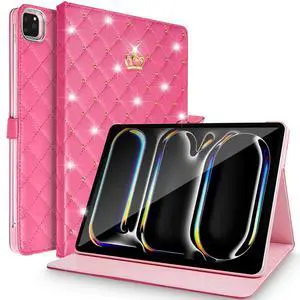 AuroiCCY for iPad Pro 11 inch (M4) 2024 Case, Shockproof PU Leather Smart Auto Wake/Sleep, Multiple View Angle, Girl Women Crown Cute Diamond Kickstand Flip Stand Folio Cover for iPad Pro 11, Hot pink
