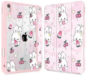 Lepeoac Case for iPad 11 inch A16 2025 Generation 11th / iPad 10.9 inch 2022 10th Gen, Buit in Pencil Holder with Shockproof Cover Clear Transparent Back Shell Auto Wake/Sleep, Rabbit & Strawberry