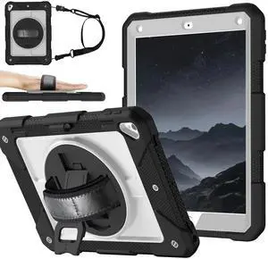 MENZO Shockproof Case for iPad 5th Gen/6th Gen/Air 2/Pro 9.7-inch with 360 Swivel Stand, Pencil Holder, Detachable Hand and Shoulder Strap, Black+Grey