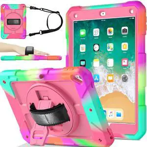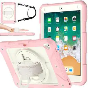 BMOUO Case for iPad 6th/5th Generation Case (9.7 inch, 2018/2017), 360Rotating Stand, Hand/Shoulder Strap Shockproof iPad 9.7 Case for iPad Air 2, Rose