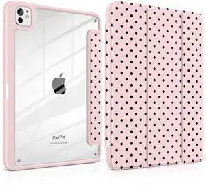 Yebiseven Case for iPad Pro 11 Inch (M5 2025 M4 2024) [Built-in Pencil Holder], Shockproof & Stylish, Clear Hard Back + Soft TPU Edge, Magnetic Trifold Stand, Auto Wake/Sleep, Pink Polka dot