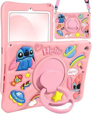 JoySolar for iPad 7th/8th/9th Case - Soft Silicone Cute Cartoon Tablet Cover with Rotating Stand & Detachable Shoulder Strap, Shockproof Tablet Case for Kids Girls, Pink