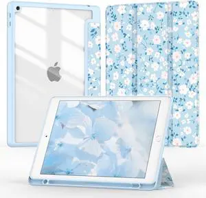 Jarviwiin Case for iPad 9th/8th/7th Generation 10.2 Inch (2021/2020/2019), Tri-Fold Smart Folio Auto Wake/Sleep Cover with Clear Back/Pencil Holder for iPad 9 8 7 Gen 10.2''(Floral Blue)