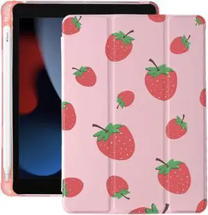 Cute Fruit Strawberry for iPad 5th/6th Generation Case with Pencil Holder, Auto Sleep/Wake, Pink Leather Soft TPU Back Cover for iPad 9.7 Inch