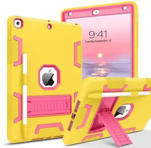 VENINGO iPad Case - 3 in 1 Heavy Duty Rugged Shockproof Protective Tablet Cover with Stand Pen Holder, Yellow/Red