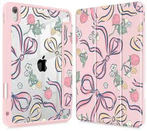 Idocolors Girly Cherry Case for iPad 2022/2025 (10th/11th Gen) 10.9", Clear Hard Back Cover with Pencil Holder, Tri-fold Stand Full Wrap Protective Case for Women Girls, Bow Cherry/Pink Case